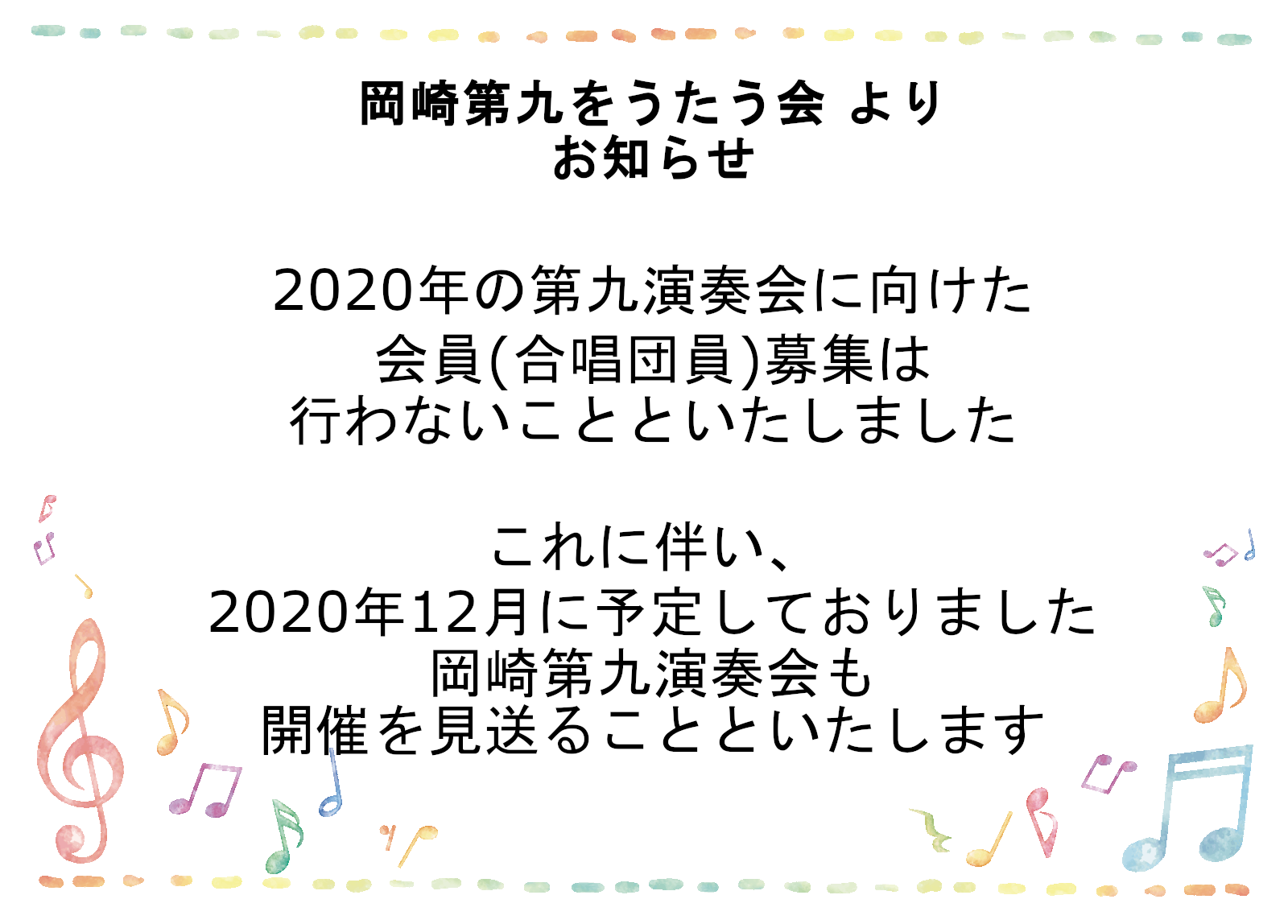 これに伴い、12月に予定しておりました岡崎第九演奏会も、開催を見送ることといたします。